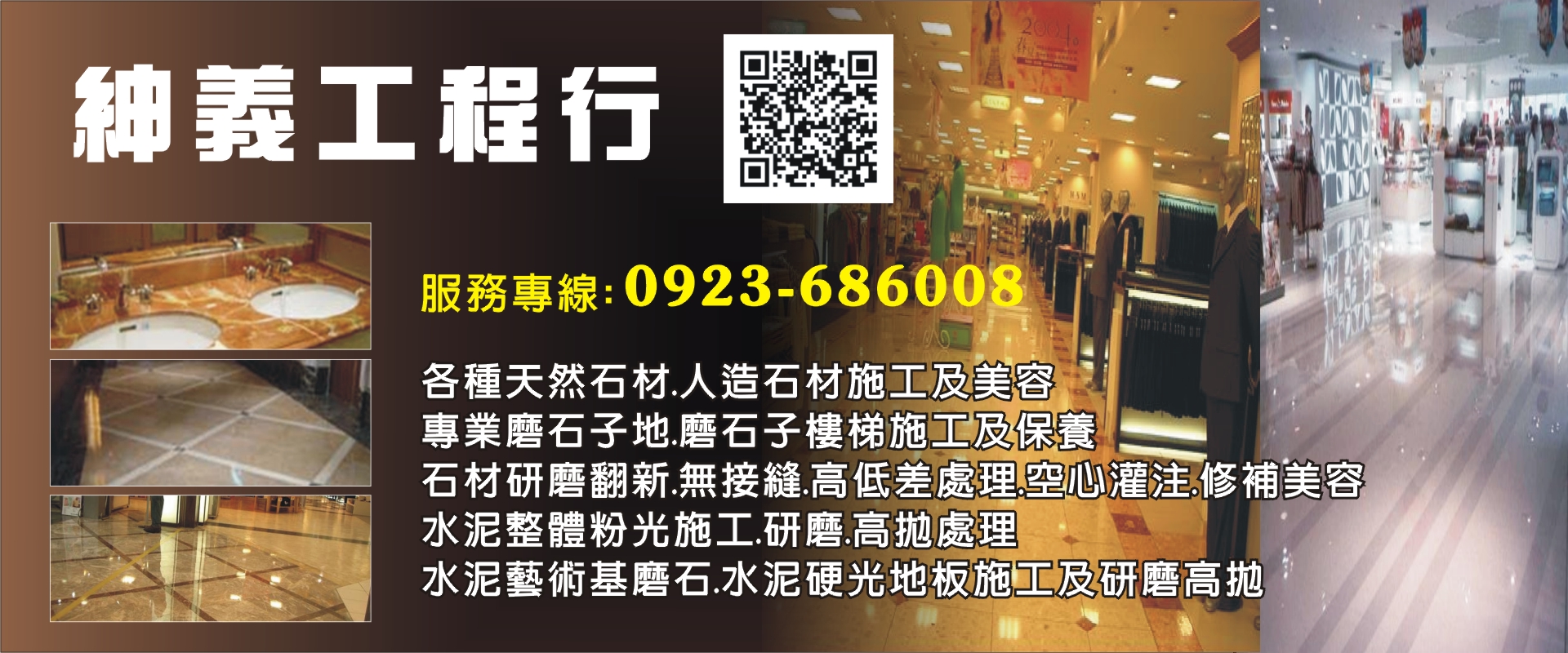 紳義工程行專營石材修補工程、拋光石英磚、磨石子地磚、磁磚、大理石、花崗石、陽角、陰角、空心灌注工程、倒角加工、拋光工程、晶化工程、鏡面研磨工程、無接縫研磨工程、地板清潔工程、地板打蠟工程、補洞工成、高低差研磨工程 (歡迎園區、廠房洽詢)